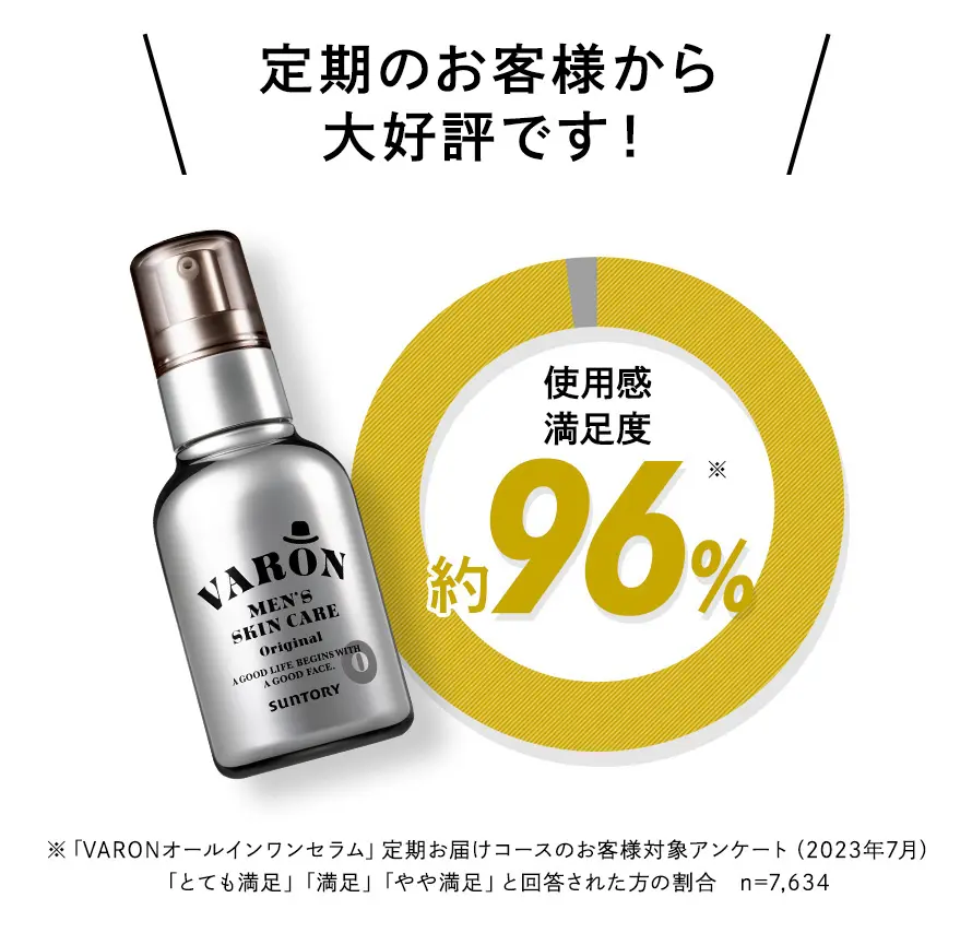 ※1「VARONオールインワンセラム」定期お届けコースのお客様対象アンケート(2023年7月)「とても満足」「満足」「やや満足」と回答された方の割合(n=7,634)